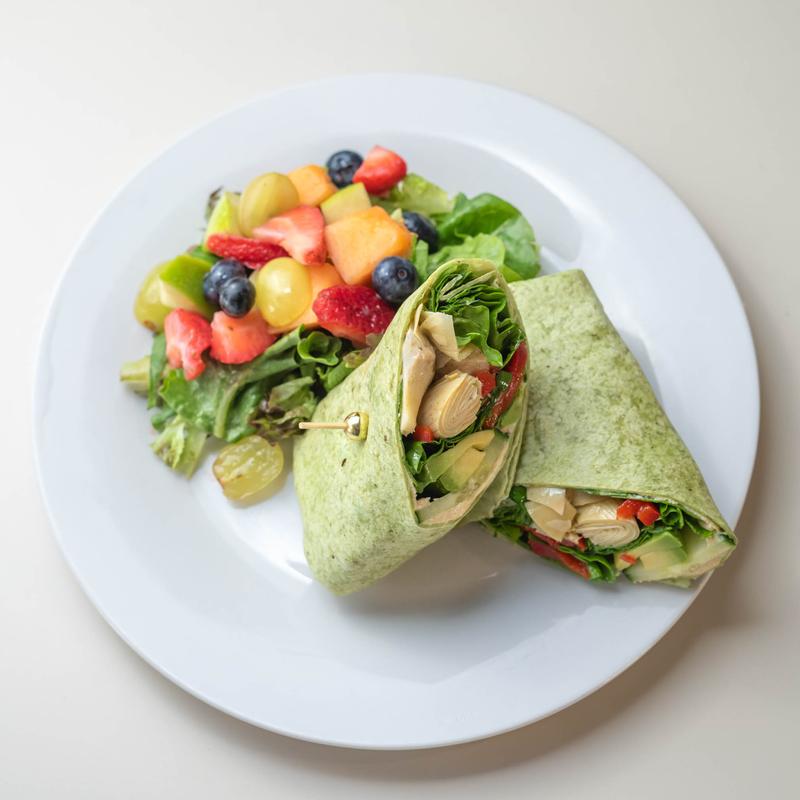 Fresh spinach, crisp cucumber, creamy avocado, roasted red peppers, artichokes, and a layer of flavorful hummus.